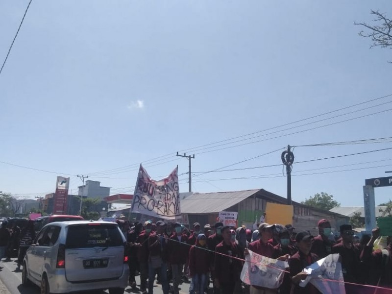 Kurang lebih 1.000 mahasiswa dengan mengenakan jas almamater merah maroon mulai berjalan menuju lokasi pusat Gedung DPRD Kabupaten Majene.