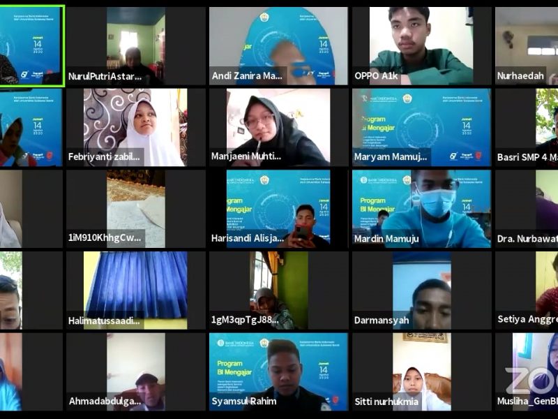 Unsulbarnews, Majene. Bank Indonesia (BI) perwakilan Sulawesi Barat (Sulbar) menggelar kuliah umum secara daring dengan tema “Peran Bank Indonesia sebagai Bank Sentral dalam Digitalisasi Ekonomi dan Keuangan untuk Indonesia Maju” pada Jumat, (14/08/20) via Zoom. Kegiatan tersebut turut dihadiri oleh Rektor, Kabiro Akademik dan Umum, para dosen, staf, dan mahasiswa Universitas Sulawesi Barat (Unsulbar) serta para pelajar dari SMP-SMA Se-Sulawesi Barat dengan total 145 peserta.