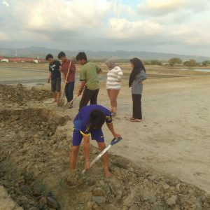 Gambar : Mahasiswa Akuakultur saat sedang mengeruk dan memperbaiki tambak untuk percontohan bagi mahasiswa Unsulbar