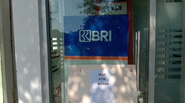 Terlihat pintu masuk ATM ditutup menggunakan tripleks dengan tulisan “Maaf ATM Rusak”.