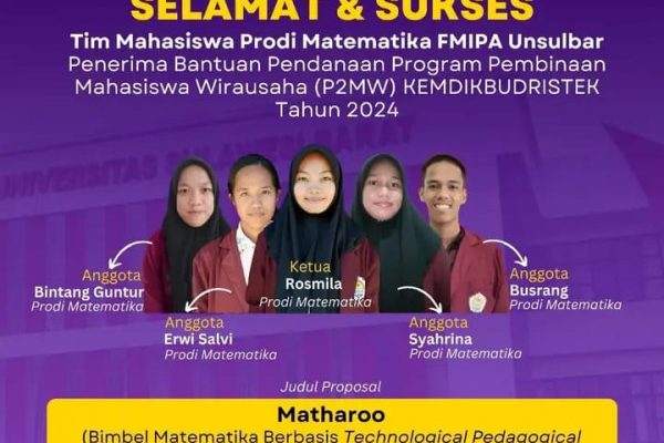 Unsulbarnews, Majene – Dua tim perwakilan Universitas Sulawesi Barat (Unsulbar) dinyatakan lolos sebagai penerima bantuan program pembinaan mahasiswa wirausaha (P2MW) tahun 2024. Tim pertama yang berhasil mendapatkan bantuan tersebut dari Fakultas Mipa (FMIPA). Tim tersebut terdiri dari lima mahasiswa dari prodi matematika, yaitu Rosmila, Bintang Guntur, Erwi Salvi, Syahrina, dan Busrang.