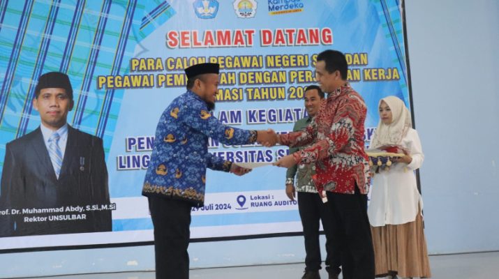Unsulbar News, Majene – Rektor Universitas Sulawesi Barat, Prof Dr Muhammad Abdy, S Si M Si menyerahkan Surat Keputusan (SK) secara langsung kepada 94 dosen Unsulbar Calon Pegawai Negeri Sipil (CPNS) dan 2 dosen Pegawai Pemerintah dengan Perjanjian Kerja (PPPK) Formasi Tahun 2023 bertempat di gedung Auditorium Mini Padzang-Padzang Unsulbar. Senin (29/7/24).