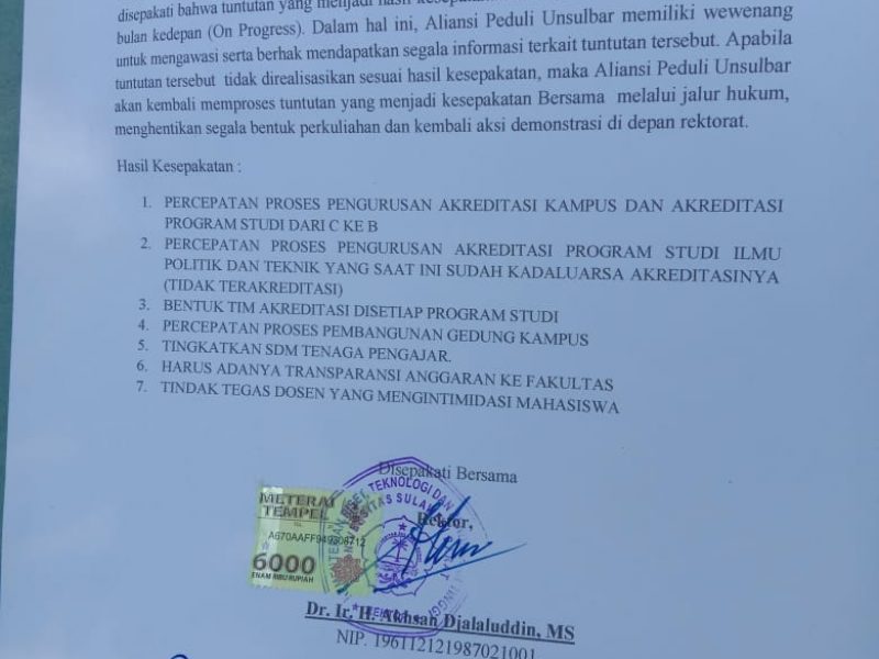 Melalui kesepakatan ini, mahasiswa ilmu politik angkatan 2012 itu berharap kedepannya Unsulbar lebih baik dan akreditasi kampus bisa melampaui kampus-kampus lain.