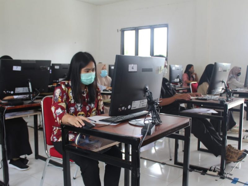 Semua peserta dan panitia terpantau tertib memakai masker. Sebagian, bahkan memakai face shield sampai sarung tangan. Di ruang ujian, jarak antar meja komputer juga diatur berjarak.