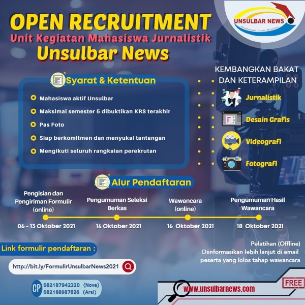 Unsulbar News tahun ini kembali membuka penerimaan anggota baru 2021. Bagi kalian mahasiswa Unsulbar bisa mengakses formulir pendaftaran atau menghubungi CP yang tertera pada flayer dibawa ini